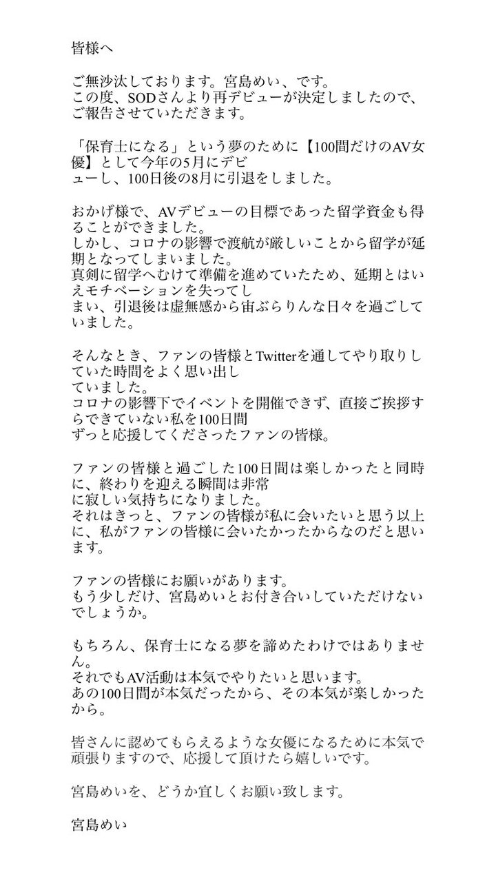 本日、宮島めいはAV業界を引退します❗100日間、関係者の皆様とファンの皆様には大変お世話になりました❗明日から普通の大学生へ戻って、保育士になる夢へ向かって猛勉強します‼ コロナの影響で全てが順調とはいかなかったけど、私は楽しかったです‼ ありがとうございました😊👋