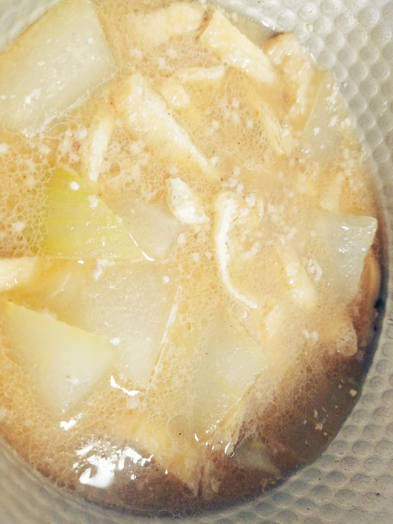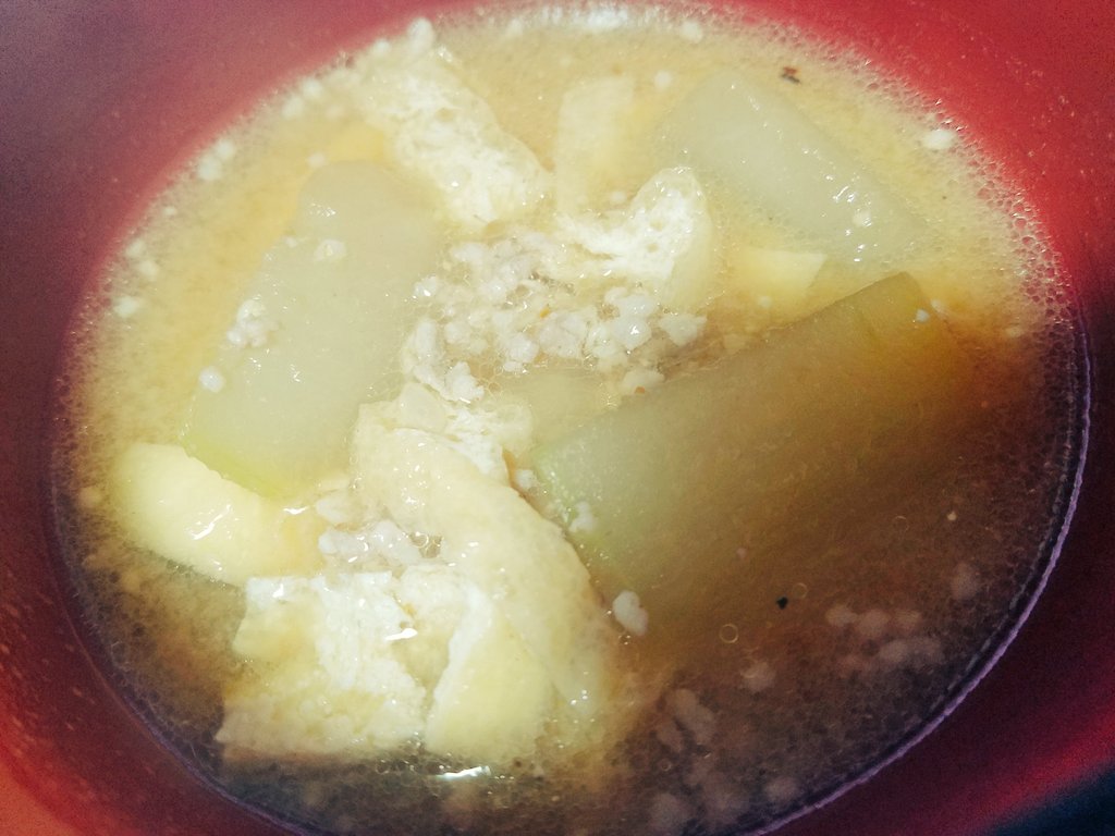 凄く久しぶりに冬瓜見つけて今日は冬瓜の味噌汁にー 本当は鯨入れるんだけど豚ひき肉で応用、免疫力、夏バテ解消して体調に気を付けて過ごしますー