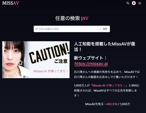 MissAVっていう日本のAV違法アップロードしまくってるサイトがDMMに潰されて石川澪なるAV女優の顔とともに「違法視聴辞めてね」みたいな内容の画像に変わったんだけど